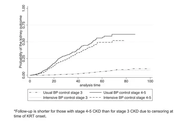 El control intensivo de la PA se asoció con un 20% menos de riesgo de resultado renal en las etapas G4 o G5 de la ERC, pero no en la etapa 3 de la ERC (figura).