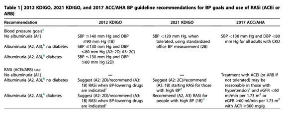 En el mismo documento, los autores de KDIGO señalan que "Para personas con una TFGe más baja, hay menos certeza sobre el beneficio de un objetivo de PA más bajo y un riesgo potencial de daño, en comparación con personas con una TFGe más alta".