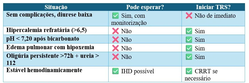 Sim. Os estudos AKIKI e STARRT-AKI mostraram que esperar até 72 horas após o início da AKI estágio 3 é razoável, mas ultrapassar esse limite pode ser prejudicial, especialmente se a oligúria persistir e a ureia ultrapassar 240 mg/dL.